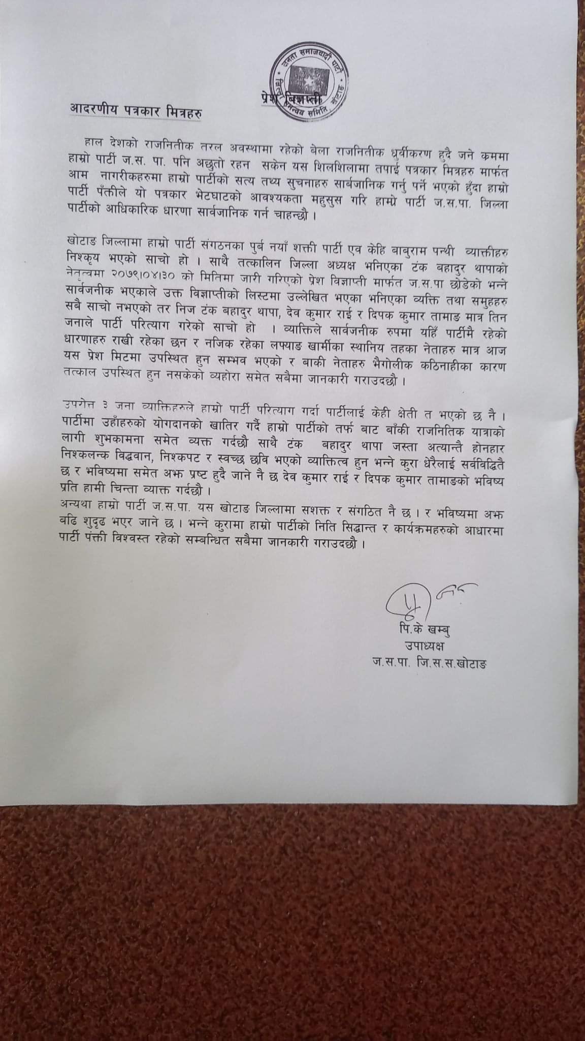 खोटाङ/ ३१ साउन । पार्टी परित्याग गरेको घोषणा सँगै खोटाङ जिल्लाको जसपा नेपालमा अन्योलता देखिएको छ । जिल्ला सदरमुकाम दिक्तेलमा मंगलबार जसपा नेपालले गरेको पत्रकार सम्मेलनमा यस्तो अन्योलता देखिएको हो ।जसपा नेपालका अध्यक्ष सहित ३९ जना नेता कार्यकताले ३० गते सोमबार पार्टी परित्याग गरेको पत्रकार सम्मेलन मार्फत दिएको जानकारी गलत भएको विज्ञप्तीमा दावि गरिएको छ । पत्रकार सम्मेलनमा अध्यक्ष भनिएको टंकबहादुर थापा, देवकुमार राई र दिपक तामाङ बाहेक अन्यले पार्टी नछोडेको विज्ञप्तीमा उल्लेख छ ।