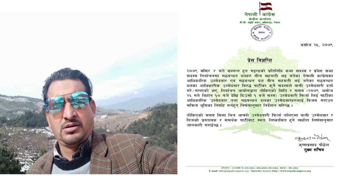 खोटाङ, २६ असोज÷ आगामी मंसिर ४ गते हुन गईरहेको निर्वाचनमा बाम लोकतान्त्रिक गठबन्धन विरुद्ध बागी उम्मेद्वारी दिएका नेपाली कांग्रेसका धर्मराज पोख्रेल नेपाली कांग्रेसको कारबाहीमा परेका छन् । निर्वाचन कार्यक्रम अन्र्तगत असोज २६ गते दिनको १ बजे सम्म उम्मेदवारी फिर्ता नलिएपछि पोख्रेल स्वतः कांग्रेसबाट निलम्बित भएका हुन् ।