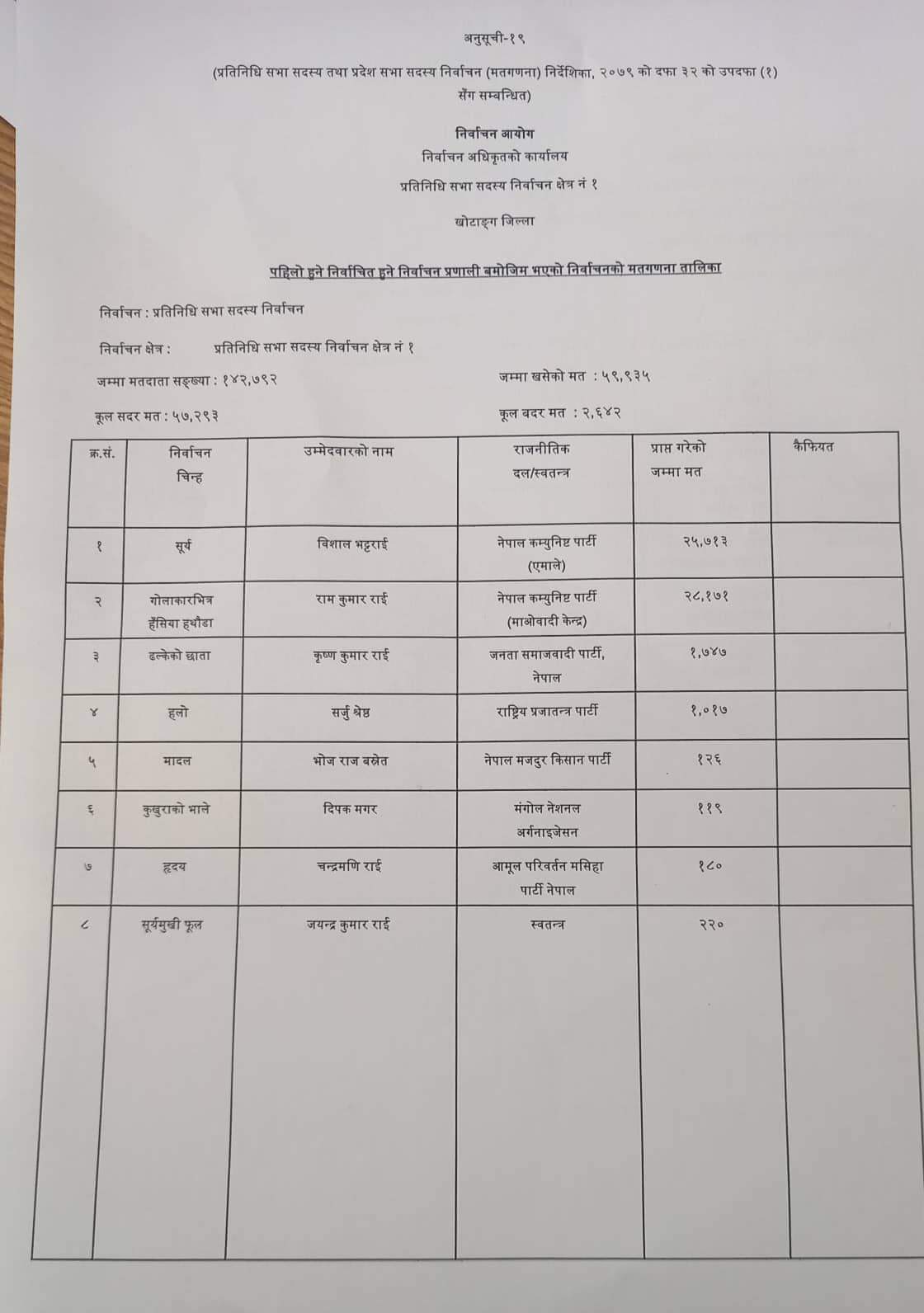 प्रतिनिधिसभा सदस्यकाे निर्वाचनमा नेकपा माओवादी केन्द्रका रामकुमार राईकाे विजय सुनिश्चित भएकाे छ। कुल खसेकाे ६७३७३ मध्य ५९,९३५ मतगणना सक्दा रामकुमार राईले २६,१०७ मत प्राप्त गरेकम छन् ।