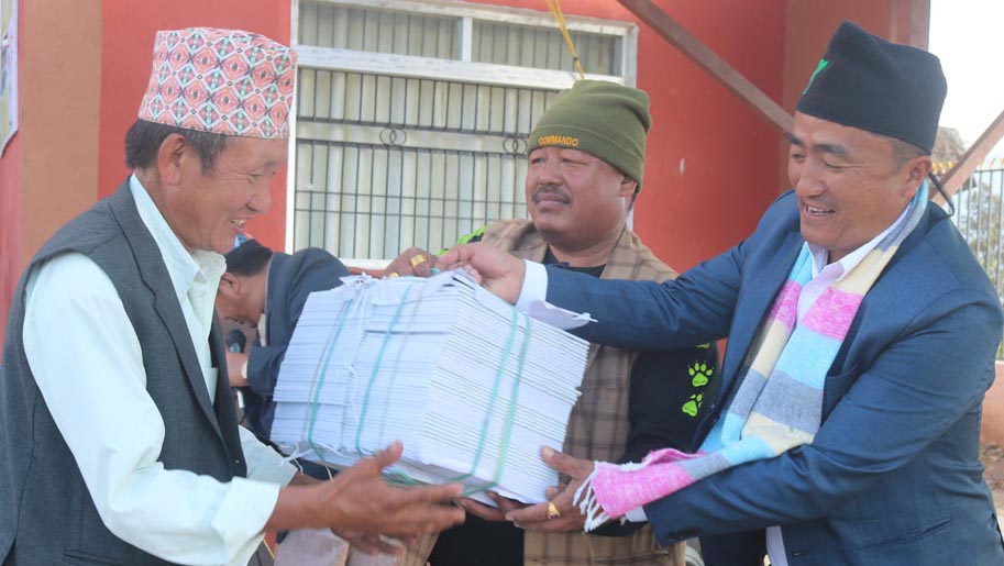 कक्षा–१ देखि कक्षा–३ सम्मका विद्याथीलाई आफैले तयार पारेको ‘विद्यार्थी अभ्यास पुस्तिका’ पालिकाले आज सोमबार निःशुल्क वितरण गरेको छ । गाउँपालिकाले कक्षा कार्य र गृहकार्य चेक गर्नेगरी प्रथम चरणमा कार्यक्रम संचालनमा ल्याएको हो । पृष्ठभूमीमा गाउँपालिकाको कार्यालय र नक्सा राखिएको ‘विद्यार्थी अभ्यास पुस्तिका’ आइतबार औपचारिक कार्यक्रम गरेर विद्यालयका प्रधानाध्यापक तथा प्रतिनिधि शिक्षकलाई हस्तान्तरण गरेको हो ।