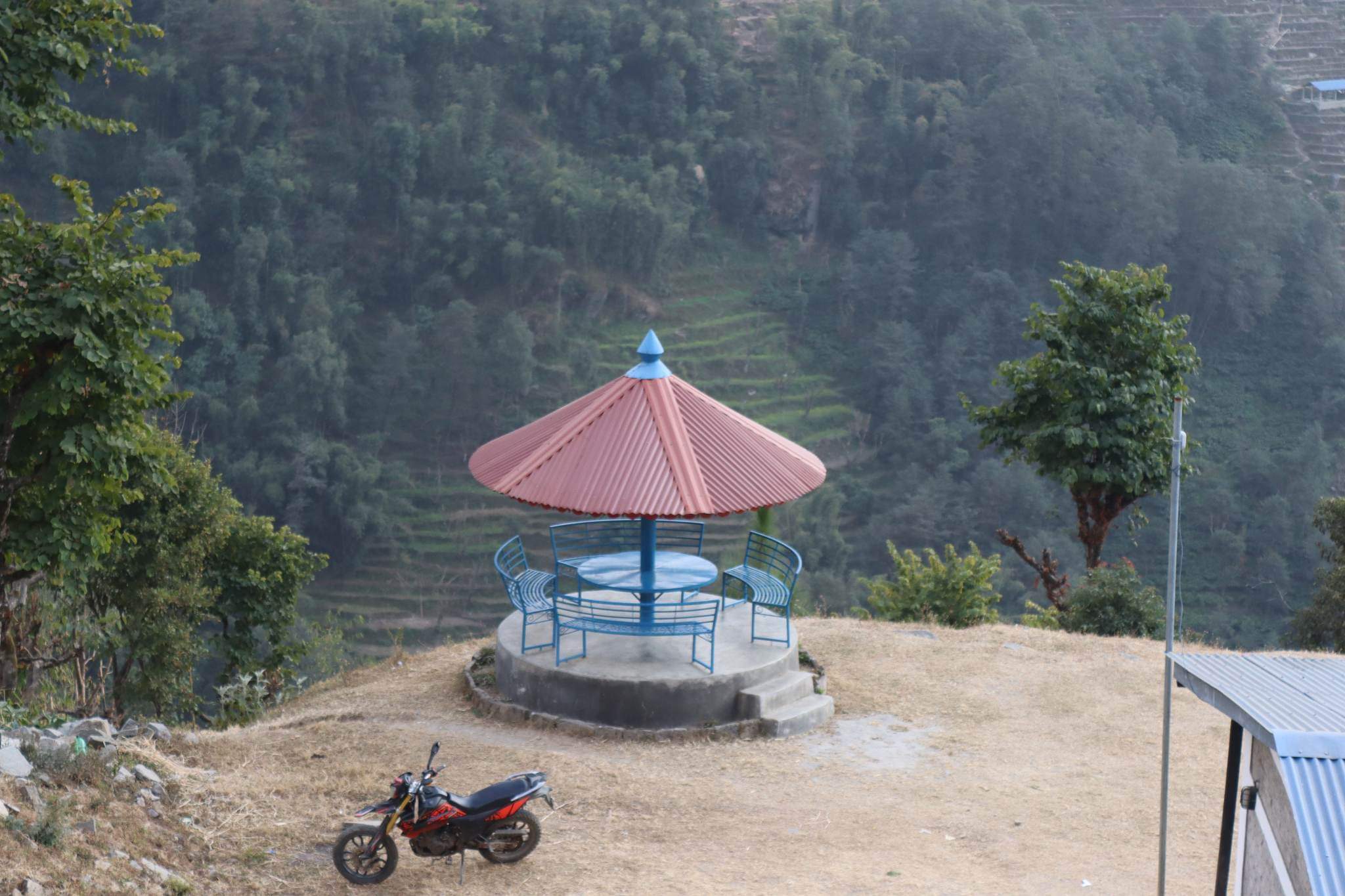 आरामका लागि : घुमाउने चाैताराे । कृष्टियन नाम राहेल (विष्णुमाया राई) काे नाममा बनाईएकाे विसाउना ।