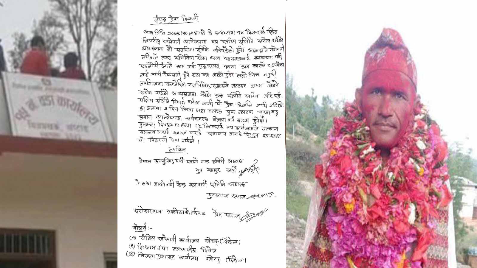 माघ, २५ बुधबार । खोटाङ जिल्लाको दिक्तेल रुपाकोट मझुवागढी नगरपालिका वडा नम्बर १५ का निर्वाचित वडा सदस्य युवबहादुर कार्कीले आफ्नै वडाका वडा अध्यक्षलाई विज्ञप्ती बुझाएका छन् । उनी लगायत दुईजना मिलेर बिजयखर्क साप्सु लिफ्टिङ आयोजनाको काम चित्त बुभल्दो नभएको भन्दै वडा कार्यालयमा विज्ञप्ती बुझाएका हुन् ।