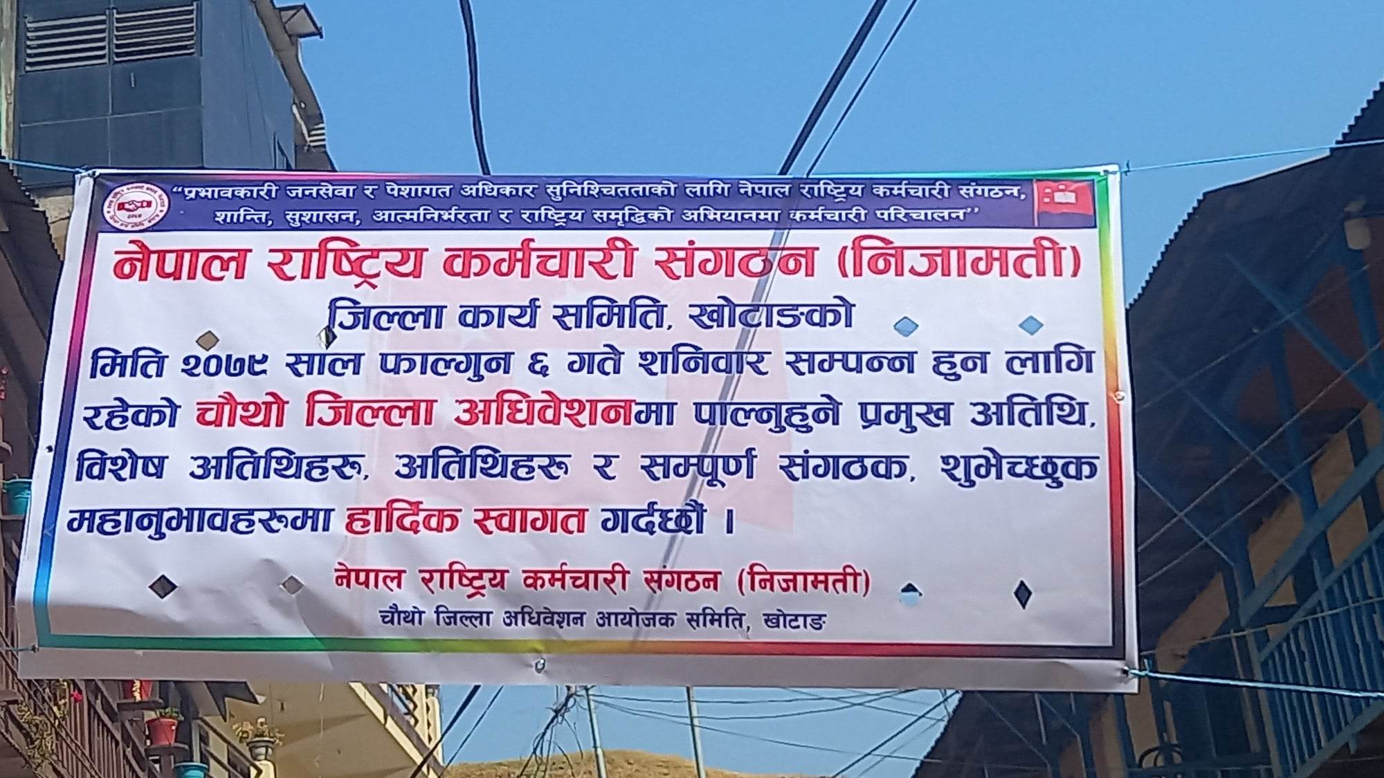 दिक्तेल । नेपाल राष्ट्रिय कर्मचारी संगठन निजामति खोटाङको चौथो जिल्ला अधिवेशनको तयारी पुरा भएको छ । भोली फागुन ६ गते शनिबार सम्पन्न हुन गईरहेको जिल्ला अधिवेशनको सम्पुर्ण तयारी पुरा भएको आयोजक समितिले जनाएको हो ।