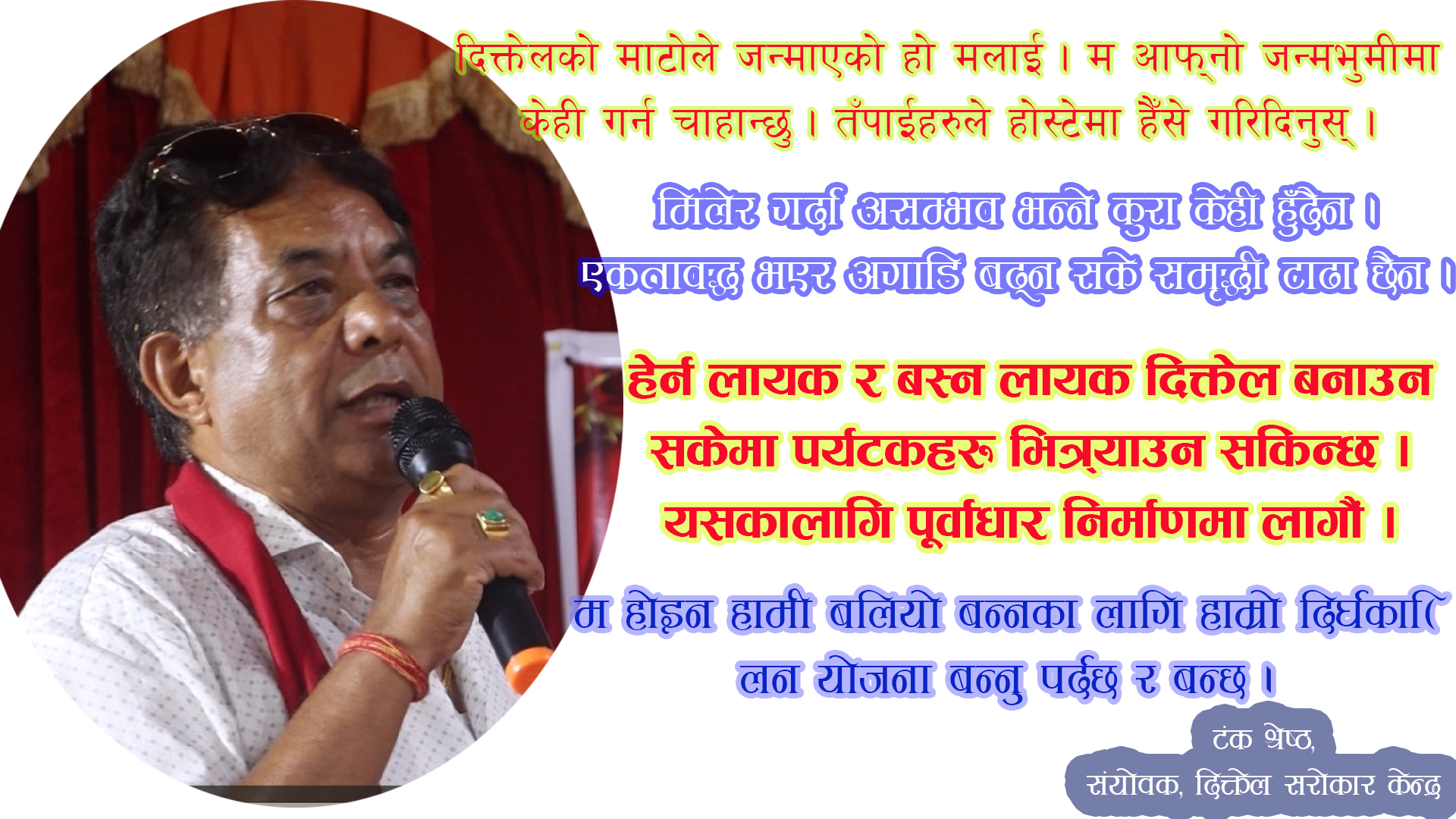 सम्मान कार्यक्रमपछि दिक्तेल सरोकार केन्द्रका लागि सुझाव संकलनका लागि कार्यक्रमको अवधारणा पत्र ध्रुव बजिमयले प्रस्तुत गर्नु भएको थियो । अवधारणा पत्र प्रस्तुत पछि सो अवधारणा पत्रमाथी केही टिप्पणी तथा सहजिकरण खुश नारायण सैँजुले गर्नु भएको छ ।