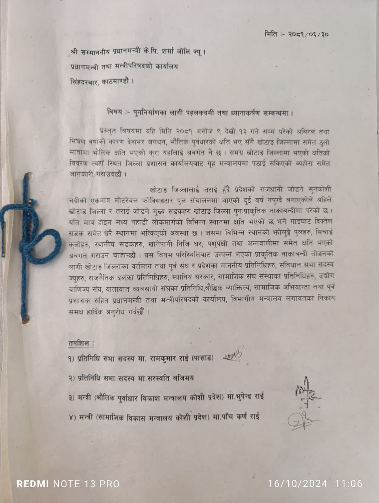 नेकपा माओवादी केन्द्रका केन्द्रिय सदस्य तथा खोटाङका प्रतिनिधी सभा सदस्य माननीय रामकुमार राईको नेतृत्वमा गएको सर्वदलिय सर्वपक्षिय टोलिले प्रधानमन्त्री केपि शर्मा ओलीलाई ध्यानाकर्षण पत्र बुझाएको छ । प्रधानमन्त्रीको कार्यालय सिँहदरबार पुगेको टोलिले गएको असोज ९ गते देखि १३ गते सम्म परेको अविरल बर्षाको कारण खोटाङमा तराईसँग सिधा जोडने फोक्सिङटार बगाएको लगायत जिल्लामा धेरै ठाउँमा विचल्ली बनाएर क्षति भएको भन्दै ध्यानकर्षण पत्र बुझाएको हो ।